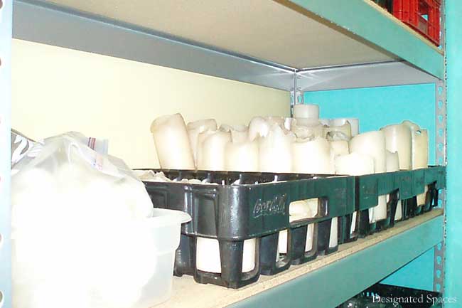 A decor storage closet accessed by a variety of people became messy. There was broken glass on the floor and the space was hazardous to enter. After cleaning up the mess and safely disposing of the broken glass, all of the usable items that remained could be inventoried. Using the existing soda and milk crates, the candles were sorted by size and placed in the crates from smallest to largest. Similar items, such as vases, were grouped together by type, size, and color for a tidier, more accessible storage closet.