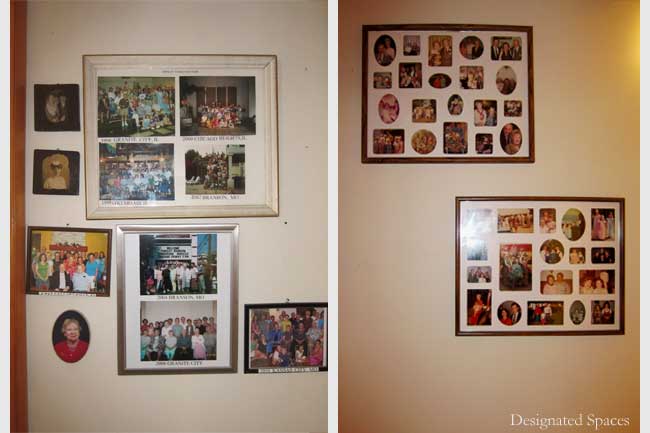 Two existing collage photo frames have now been updated and relocated. The photos have been loosely grouped chronologically from left to right in each collage photo frame. Core family groups are intentionally clustered together. A story is told with this specific group of family photos together on one wall. Several individual lives that have interacted with one another intersect through time and those moments have been captured through photography.