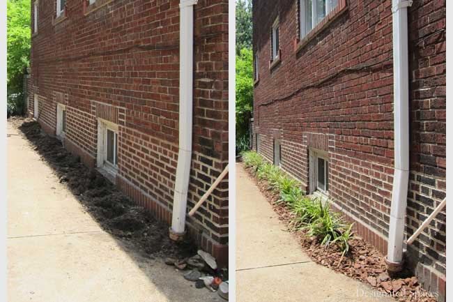 As part of a larger landscape project, this driveway landscaping repurposes perennial flowers and ornamental grasses. The ivy and weeds that enveloped the driveway plant bed have been removed and the existing plants have been dug up for transplanting. The ornamental grasses have been transplanted from their original location surrounding a pool. The grasses have been split in order to spread them out alongside the driveway. The two-leafed green plants flower seasonally and have been planted in front of the windows since they are shorter and will not block light entering into the lower level of the home. Lastly, brown mulch was added to suppress weeds and eventually improve the texture of the soil below.