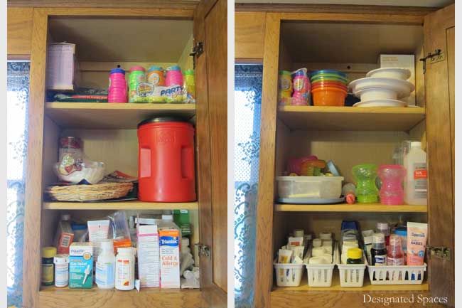 Adjacent to the sink on the left are ceramic mugs and drinking glasses. Below the sink are cleaning supplies separated into a bin and a tote with a handle for transporting around while cleaning the house. The handheld broom, dustpan, and fly swatters are hung on hooks alongside the cleaning supplies. To the right of the sink are vitamins and medicine sorted in open baskets. Baby bottles and dishes are stored on the two shelves above the medicine.