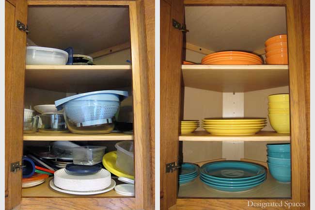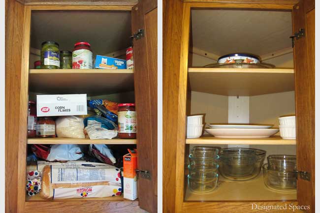 In the corner wall cabinet to the right of the sink are stored glass food containers, mixing bowls, and serving platters. Below is another lazy susan (not shown) containing coffee, tea, drink mixes, sugar, flour, and large cereal boxes. The wall cabinet to the right contains baby food and assorted boxed foods. The base cabinet has tiered shelves lined with canned goods and other various foods below. The wall cabinets above the refrigerator hold rarely used items including lighting supplies and glass vases.