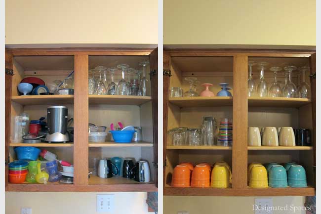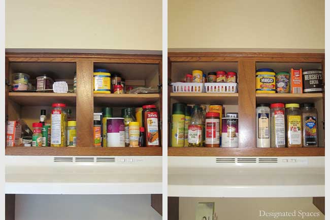 This kitchen needed some organizing baskets and bins in order to sort and separate all of the kitchen utensils, tools, and other supplies. The utensils have been consolidated into one drawer and in the cabinet below are now all of the rarely used appliances. Next to the range is a drawer with scissors, openers, measuring spoons, serving spoons, and spatulas. The cabinet below holds all the pots and pans on two drawers. Above the microwave are cooking and baking supplies along with bulk seasonings. To the right of the microwave are spices and seasonings sorted by type on three turntables. In the corner wall cabinet are three new sets of dishes sorted by color. Below the corner cabinet and on the other side of the range is a lazy susan (not shown) containing slicers, graters, measuring cups, and baking dishes.