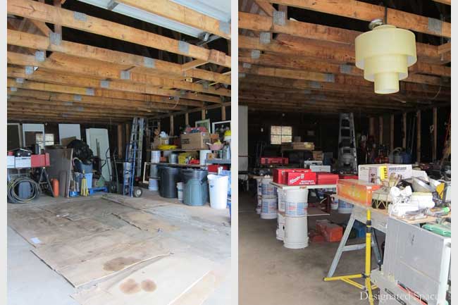 Preparing for a garage sale includes deciding on a sale date, collecting and displaying sale items, and promoting the sale. In order to use the entire garage space efficiently to display sale items for a sale some simple solutions were implemented. Empty paint buckets and existing doors were used to create temporary tables to display tools. Existing nails around the garage perimeter held garden hose and saws. A metal coat rack was used to display extension cords. Paint supplies and household cleaning tools were arranged on shelves by type. Landscaping tools, cleaning tools, and salvage materials were grouped along two walls of the garage.